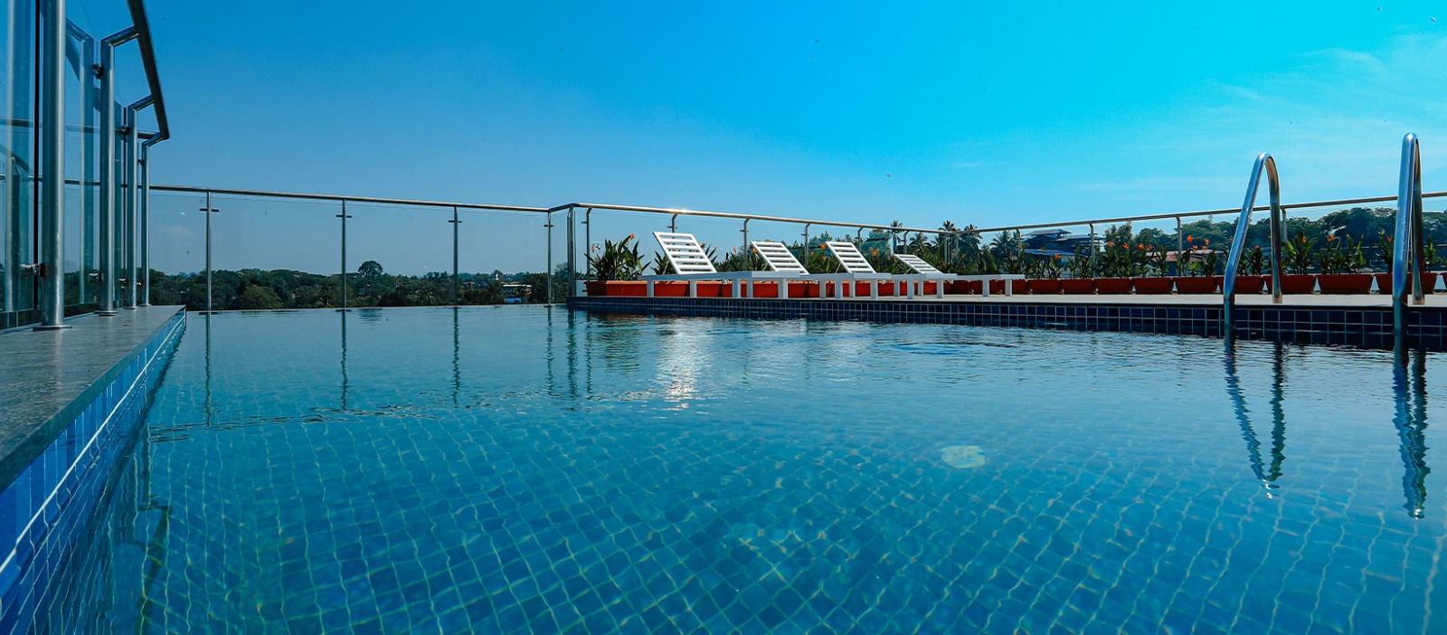One of the most remarkable features of Hotel Saffron is its rooftop infinity pool. Guests can relax while soaking in panoramic views of the surrounding valleys, hills, and the town below. Whether it’s an early morning swim or a sunset dip, the pool area offers the perfect setting to unwind, meditate, or simply admire the beauty of Wayanad.